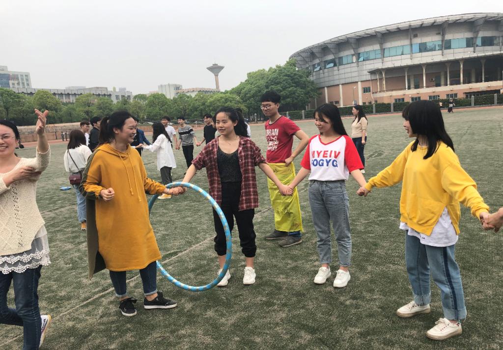 四个学院的研究生以学院为单位组成“小黄队”“恰同学”“原谅队”等队伍,通过“团队造型摆阵”“三人四足接力”“交换名字”“一圈到底”和“跳绳比赛”等活动展开竞争。优胜方获得了精美笔记本、陶瓷杯、书立架、文件收纳框等礼品。