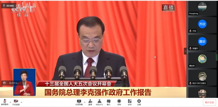 首先是观看国务院总理李克强在十三届全国人大五次会议开幕式上所作的报告,通过报告,同志们了解了过去一年党中央带领全国人民艰苦奋斗取得的成果,也学到了未来我国的发展方向。