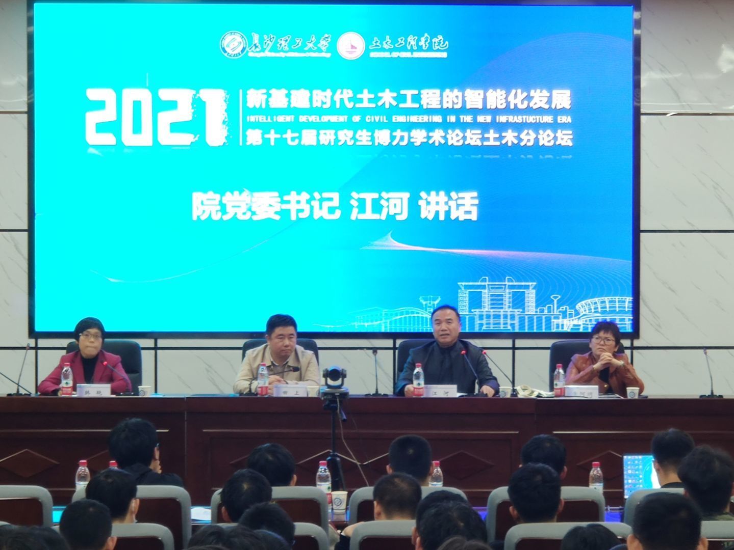 最后,江河作了总结讲话并宣布论坛开幕。他指出,新一轮科技革命和产业变革正在重构全球创新版图、重塑全球经济结构。以人工智能为代表的新信息技术加速突破应用,为智慧城市的建设及土木行业的改革升级带新的机遇和挑战。为了更好的抢抓发展机遇,他提出了三点希望:第一,做科学研究要牢牢地抓住科学问题不放;第二,做科学研究要耐得住寂寞;第三,应该主动与专家学者去学习交流。他希望,青年研究生做到“在做学问中学做人,在做人中学做学问”,早日成长为德才兼备的栋梁之才。