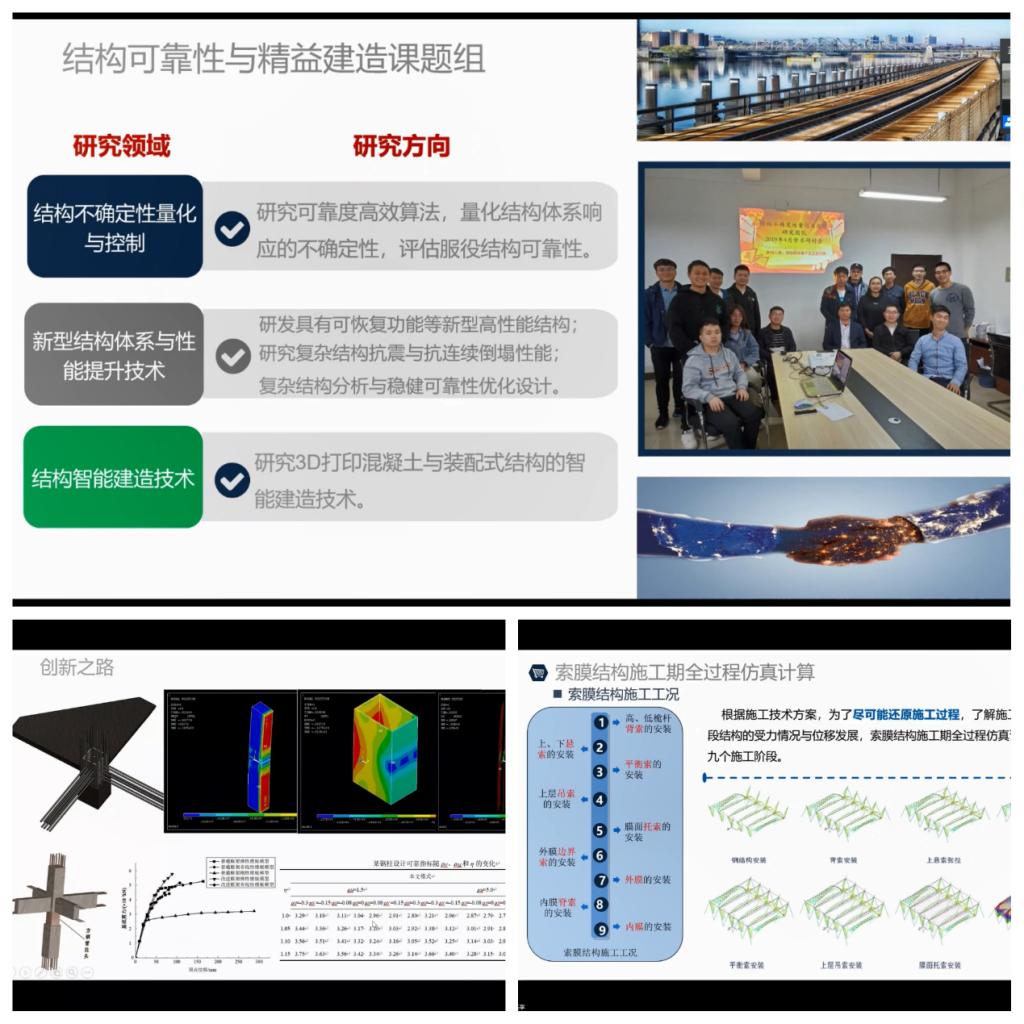 讲座伊始,周浩师兄岳阳三荷机场航站为实例,分别介绍了该项目的结构平面布置、索系统、钢结构系统和膜系统,然后深入讲解了大跨空间结构抗连续倒塌总体思路,建立有限元分析模型对结构进行抗连续倒塌动力分析,以较精确模拟大跨度空间结构的抗连续倒塌过程,并结合工程情况采用考虑初始条件的等效荷载瞬时卸载法进行抗连续倒塌分析。随后展示了索膜结构施工期全过程的仿真计算,以及利用ANSYS与MATLAB二者的优势,通过Python编程实现了两者的数据传递与调用,开发了用于结构体系失效模式搜寻与可靠度计算的软件,可以大大提高复杂结构可靠性分析效率。