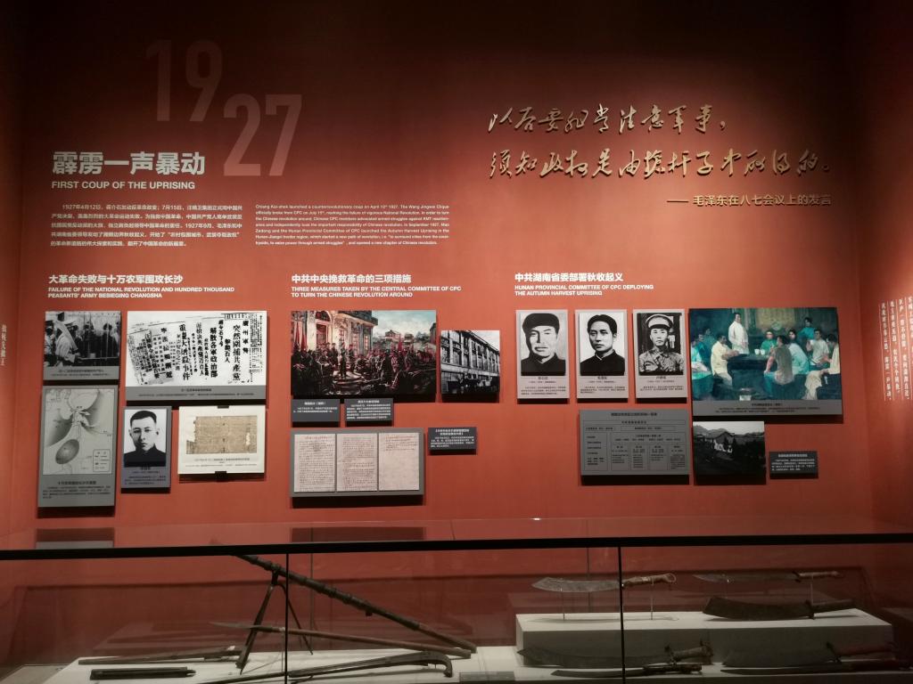之后,便到了下一个的展厅,一幅幅历史画卷在组员面前展开,最先映入眼帘的是几面被保护好的中国农业革命军的旗帜,和工农革命军战士冲锋时的雕像我们看到了蒋介石背叛革命后,毛泽东和中共湖南省委乘机发动秋收起义;我们还看到当时十万农民大军围攻长沙和秋收起义的全过程:湘赣边秋收起义爆发、文家市会师、红军两次攻长沙等。在最后还有一块丰碑,记载了部分革命英烈的姓名和照片。