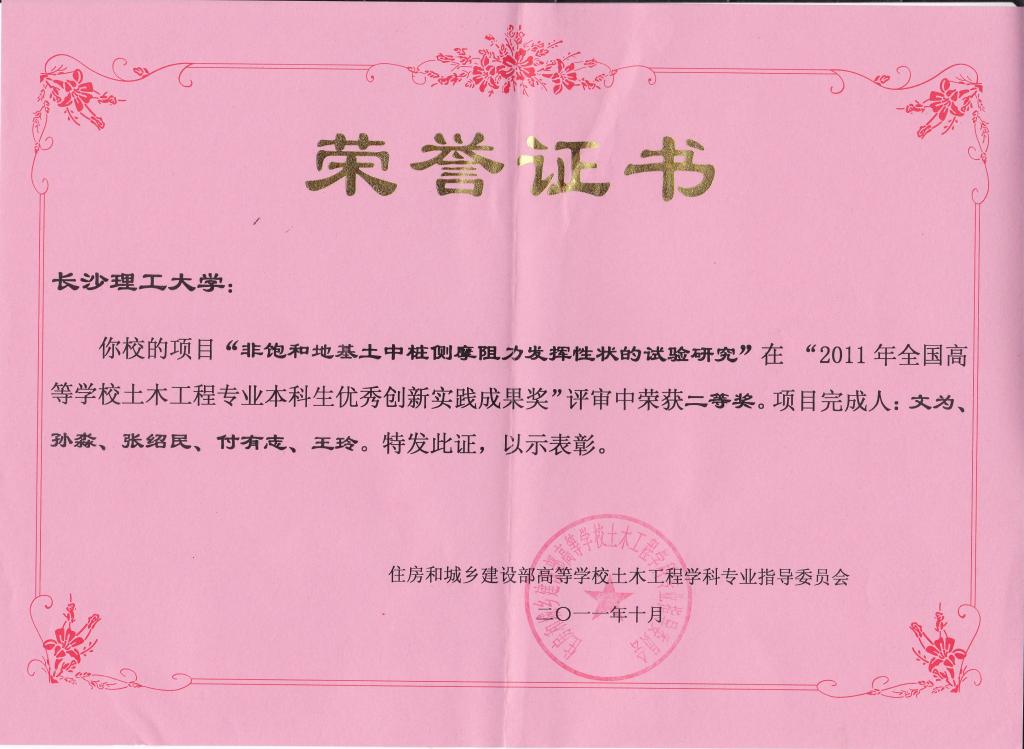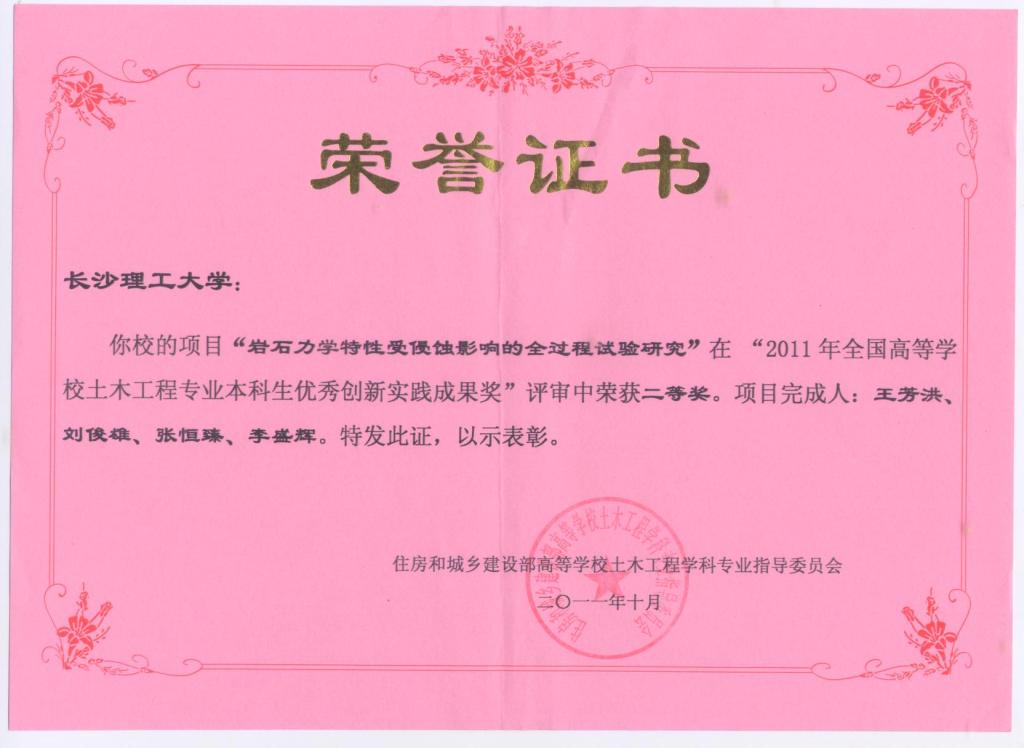 我院王芳洪、文为两位同学的项目《岩石力学特性受侵蚀影响的全过程实验研究》和《非饱和地基土中桩侧摩阻力发挥性状的实验研究》(由贺炜、王泓华老师指导)荣获2011年全国土木工程专业本科生优秀创新实践成果二等奖。此奖只有通过国家城乡建设部土木工程专业评估的学校才能申报,2009年我院通过专业评估后是首次申报,本次就有2项喜获二等奖。