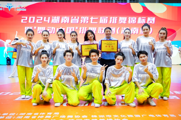经过选拔,304永利集团官网入口排舞队以长沙市资格赛和全民健身挑战赛第一名的成绩晋级本次湖南省排舞比赛。在领队刘丽云,教练张歌林的带领下共派出12名队员参加。经过拼搏,最终获得小集体项目特等奖。同时被组委会评为“体育道德风尚奖”。张歌林老师获优秀教练员称号。