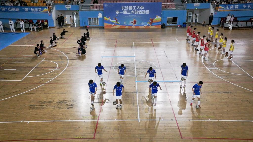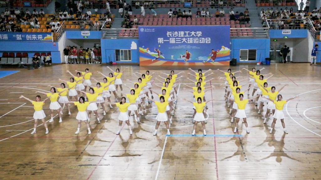 由长沙勇胜职业篮球俱乐部球员与湖南师大校队联袂呈现的扣篮秀引发全场沸腾。“三大球”的动态组合表演,融合了体育竞技的激情与团体操的艺术性,向师生们传递了团结、拼搏与创新的精神。