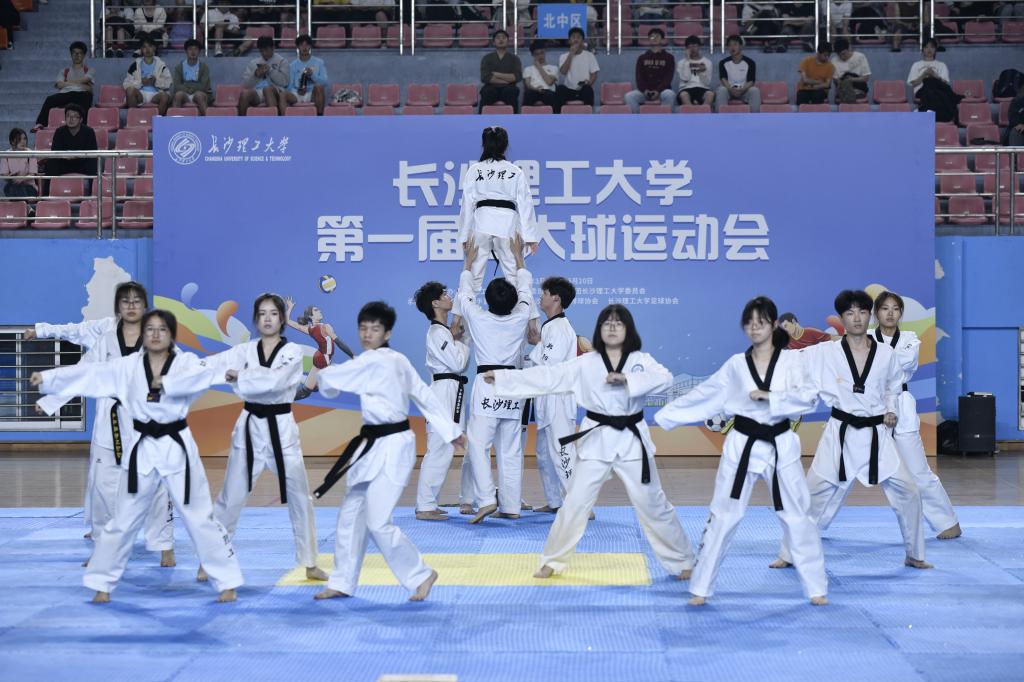 文体表演环节掀起阵阵高潮。校大学生艺术团以活力四射的啦啦操《跃动青春》点燃全场,翻腾跃动的身影诠释着青年风采;跆拳道队的表演刚柔并济,是对三大球少年们“敢拼敢战”的最强呼应。