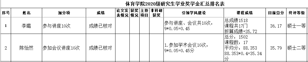 依据《304永利集团官网入口体育学院全日制研究生学业奖学金评审办法》”有关规定,经研究生自愿申请,学院研究生奖学金评审委员会会认真评审,拟推荐以下两名同学为我院2021-2022年度“硕士研究生学业奖学金”获奖者,现予以公示(具体名单见附件):