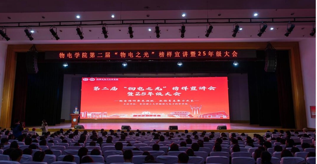 2025 年11月12日,物电学院于金盆岭5号教学楼大礼堂举办第二届“物电之光”榜样宣讲暨25级年级大会,物电学院党委书记张国强、党委副书记叶正芳、关工委常务副主任李新…