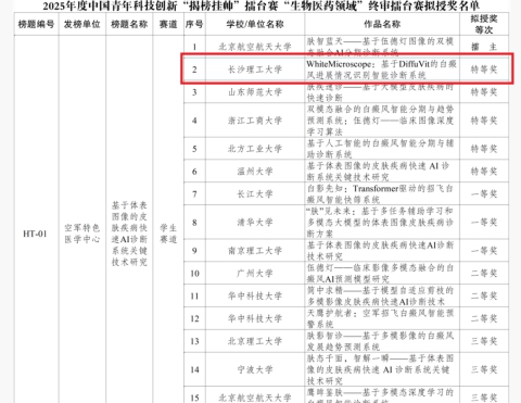 在近日落幕的2025年度中国青年科技创新“揭榜挂帅”擂台赛中,我院王新、王威老师带领的学生团队凭借“WhiteMicroscope:基于DiffuVit的白癜风进展情况识别智能诊断系统”,在清华大学、华中科技大学等全国顶尖高校组成的279支队伍中脱颖而出,成功斩获“生物医药领域”主擂台赛特等奖,这也是永利官网首次获得挑战杯“揭榜挂帅”赛道特等奖,以实际成果展现了学校创新人才培养的扎实成效。