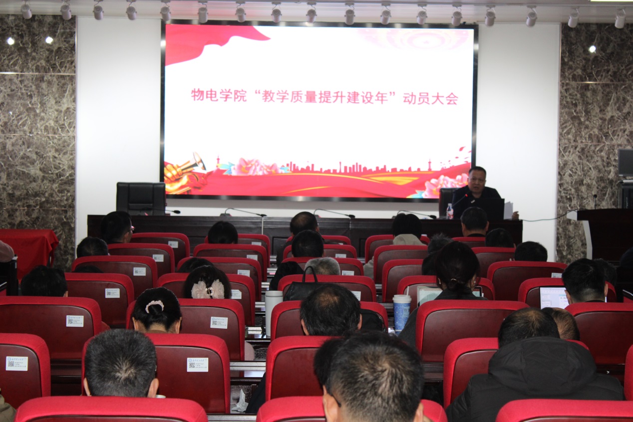 在物电学院“教学质量提升建设年”动员大会上,王威处长应邀出席并讲话。他首先肯定了学院在人才培养工作中所取得的成绩,并结合学校教务处工作重点,对学院教学质量提升从多维度提出了相关要求与建议。王处长强调,要进一步加强教学过程管理,推进人工智能赋能教育教学,深化教育教学改革,注重学生创新能力培养,希望物电学院以此次动员大会为契机,推动教学质量实现质的飞跃,为学校整体教学水平提升发挥示范引领作用。