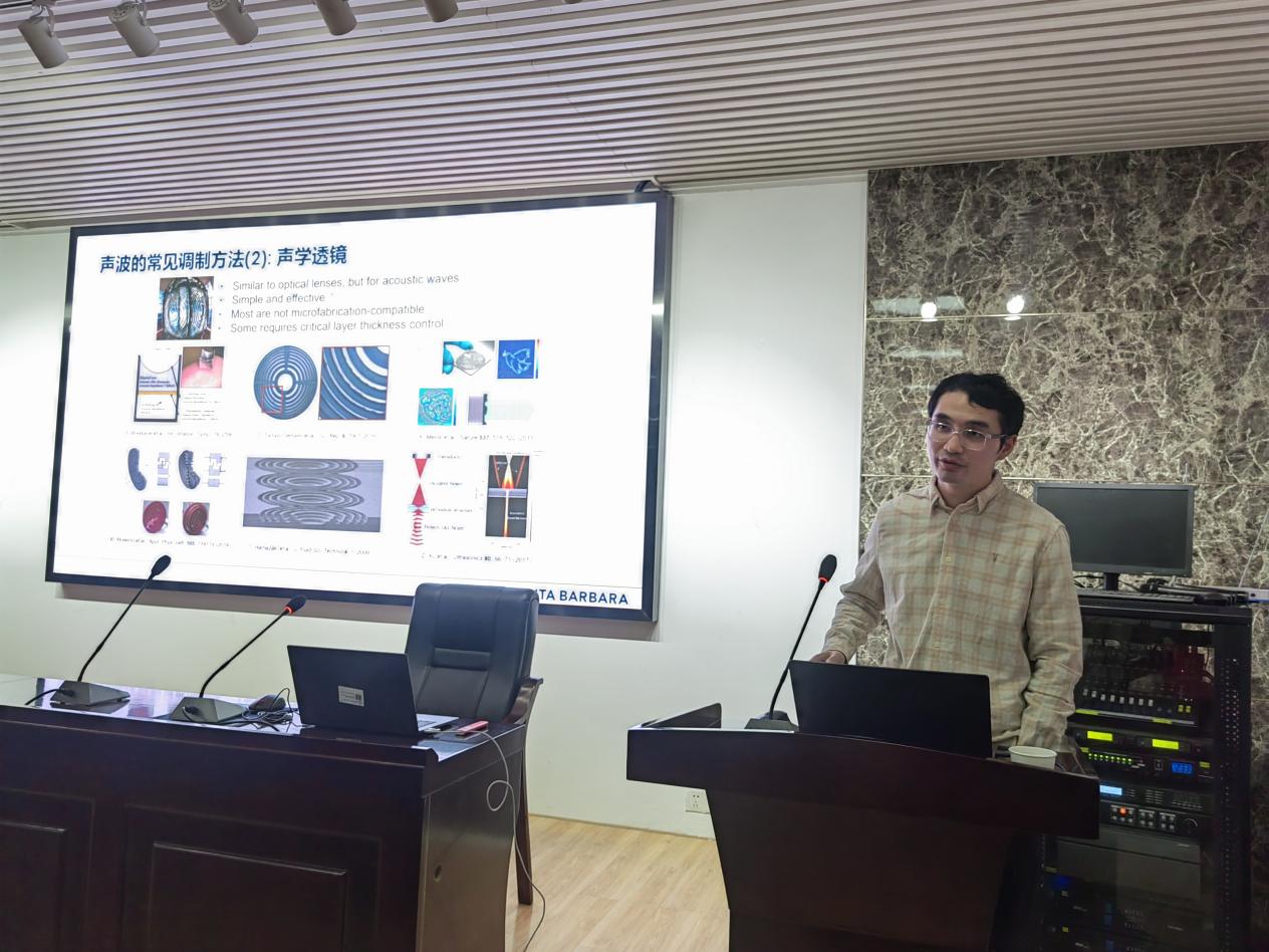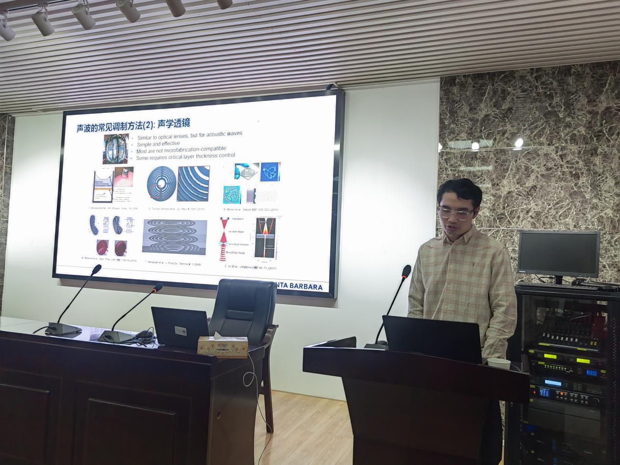 此次报告,唐博士后为我们简单介绍了作为超声换能器的常见组件之一的声学透镜以及其应用范围常因为加工精度不足或尺寸过大而被限制的问题。针对这个问题,唐博士后通过微加工工艺,开发了一系列微型平面菲涅尔声学透镜来实现超声聚焦和声镊功能,并基于这些器件开发了生物医疗以及声波操控相关的应用。报告结束时,师生们与唐博士后进行了深入的探讨交流,此次报告顺利落幕。