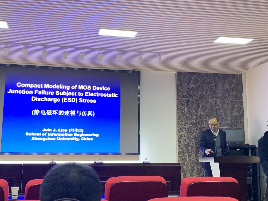20191217日,应我院邀请,郑州大学刘俊杰教授为我院师生作了一场题为Compact Modeling of Junction Failure in Semiconductor Devices Subject to Electrostatic Discharge Stresses的学术讲座。报告会邹望辉副教授主持,部分老师、本科生和全体研究生参加了此次讲座。
