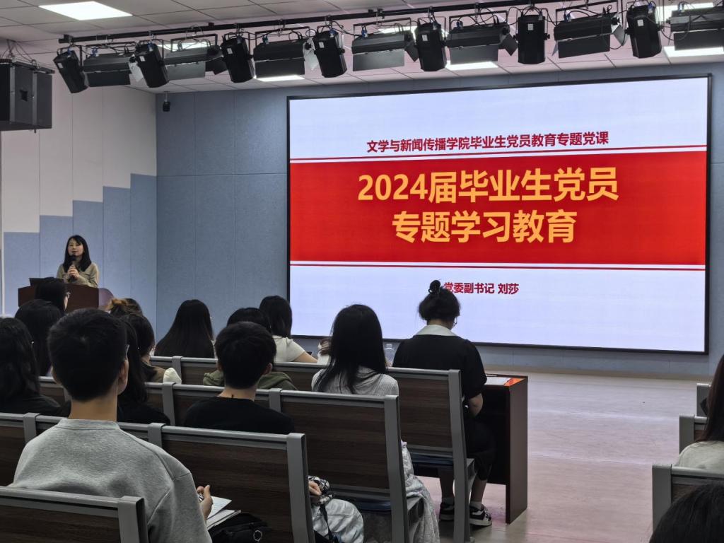 毕业生党员群体作为毕业生中的先进群体,不仅肩负着当代大学生的历史使命,还承担着当代党员应尽的责任。为了进一步强化毕业生党员的服务意识和责任意识,2024年6月4日,304永利集团官网入口文学与新闻传播学院在九教一楼报告厅举办了文新学院2024届毕业生党员专题学习教育活动,活动由文新学院党委副书记刘莎主持。