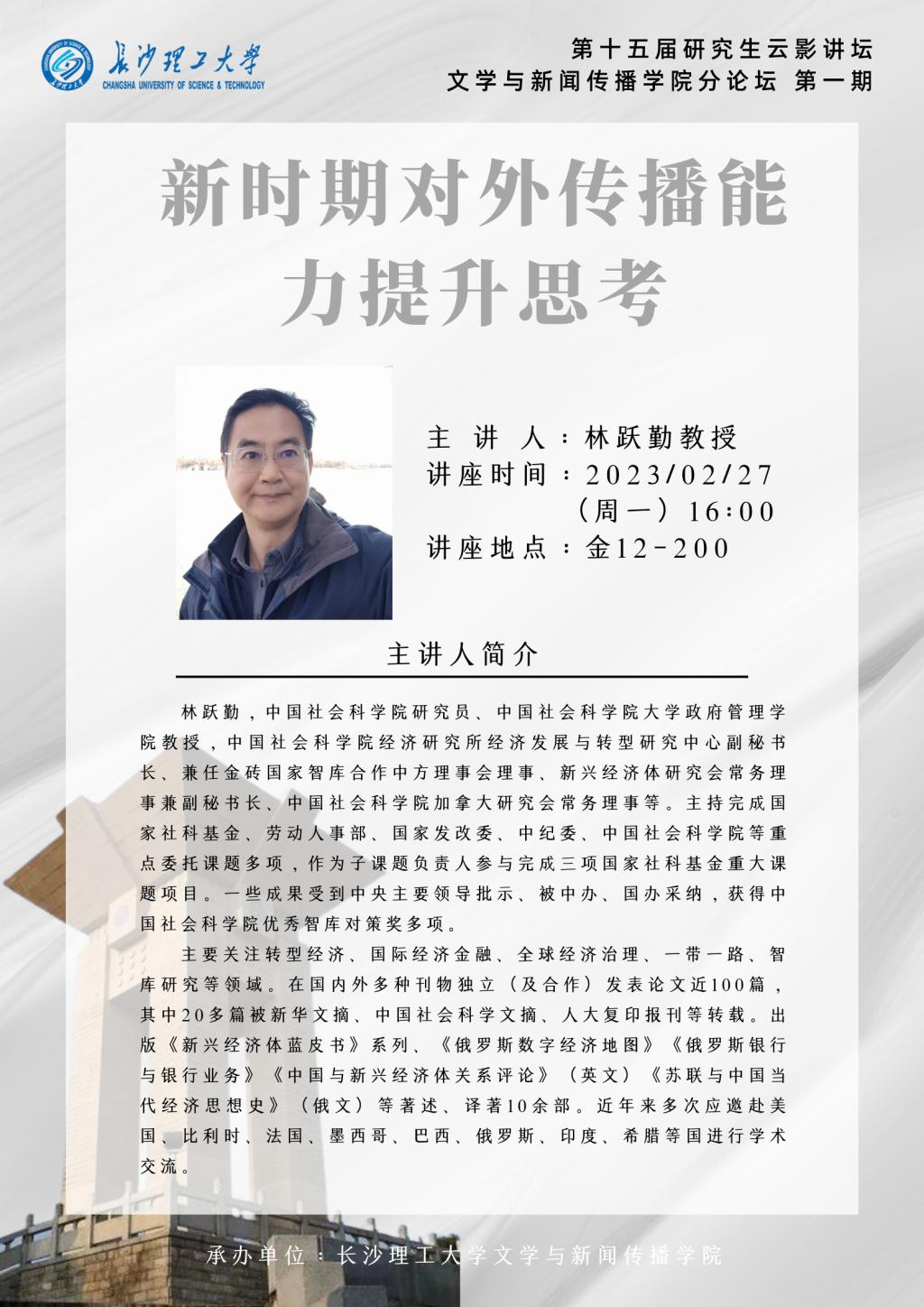 2023年2月27日下午,在304永利集团官网入口金盆岭校区12号教学楼内,第十五届研究生云影讲坛文新学院分论坛第一期如约进行。本次讲座邀请中国社会科学院研究院林跃勤教授为学生们讲授主题为“新时期对外传播能力提升思考”的讲座。