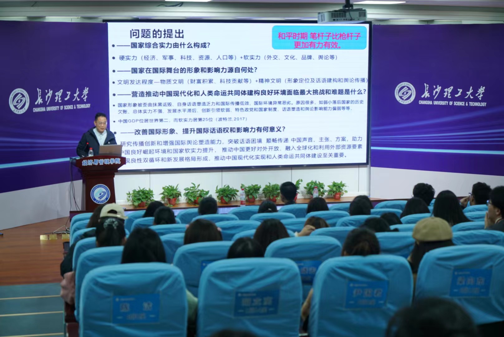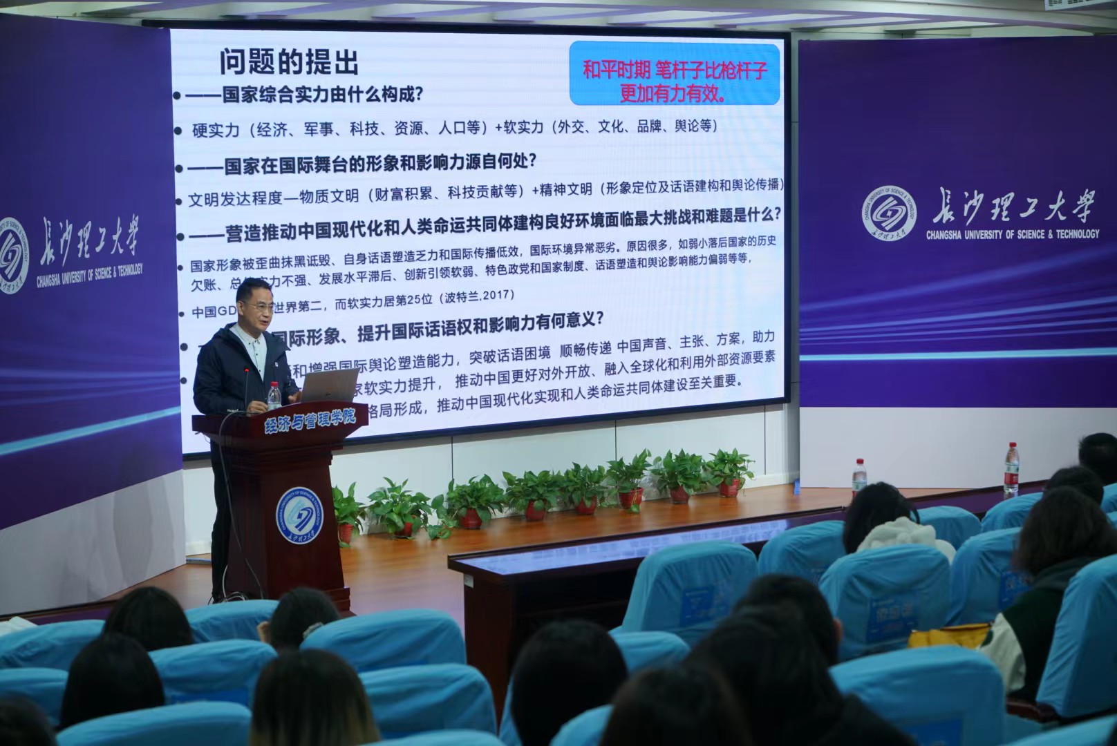 紧接着,林教授结合西方国家提出的“中国威胁论”“中国崩溃论”等案例分析了对外传播能力体系在外部环境中所遇到的挑战。并且深入剖析了我国国际传播体制所存在的缺陷,然后对思维意识、传播渠道、传播内容等方面面临的挑战与困境做了系统阐释。最后,林教授提到“要着力打造中国自己的具有竞争力的传播‘航空母舰’”。并特别强调了打造多元化国际传播主体队伍在对外传播策略中的重要性。