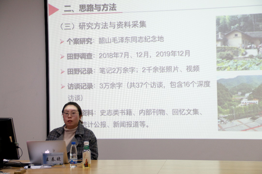 在主题演讲环节中,王春晓从社会空间理论和媒介地理学非表征理论出发,将空间视为文化意义的承载体和传播媒介,以韶山毛泽东纪念地为案例,综合运用田野观察、访谈等质化研究方法,探讨了当代红色文化空间中的意义实践图景,以期为突破红色文化传播困境、凝聚文化认同提供借鉴。