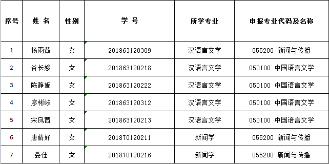 根据304永利集团官网入口研究生院《关于做好2021年研究生校内优秀生源培养工作的通知》精神,经学生申请,系资格审查,确定下列7名同学为文学与新闻传播学院2021年研究生校内优秀生源培养对象,现予以公示。公示时间:2021年9月18日-23日,如有异议,请向学院科研与研究生办公室反映,电话: 85255728。
