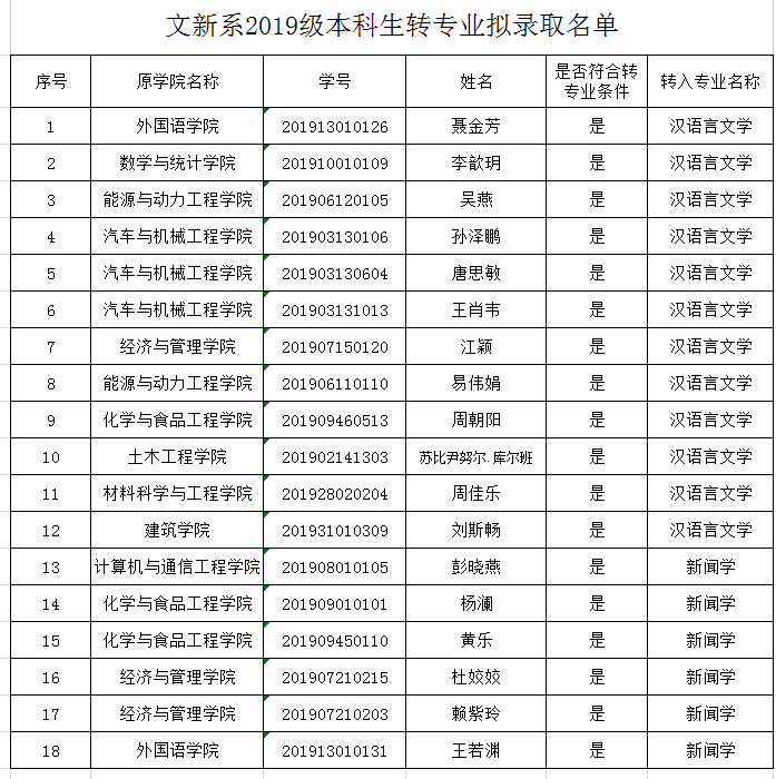 根据《304永利集团官网入口生转专业管理办法》和学校《关于适当调整2019级在校本科生转专业(类)报名及考核办法的通知》的通知要求,经个人申请,系部考核,文新系转专业工作领导小组讨论决定,以下同学拟录取到文新系。现予以公示,公示时间为5月27日到30日,如有异议,请向系教务办反映,电话85256150 黄老师。