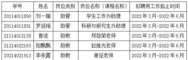根据304永利集团官网入口研究生“三助一辅”工作管理办法,经自主申报、导师推荐、设岗单位同意、学院考核,现将2021-2022学年第二学期拟聘用研究生“三助一辅”岗位名单公示如下: