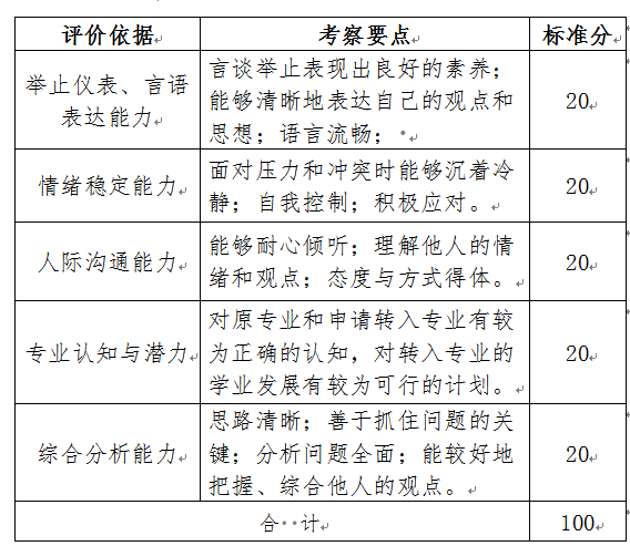 申请转入我院汉语言文学专业、新闻学专业、网络与新媒体专业的学生均须参加面试。面试评分标准如表2所示。