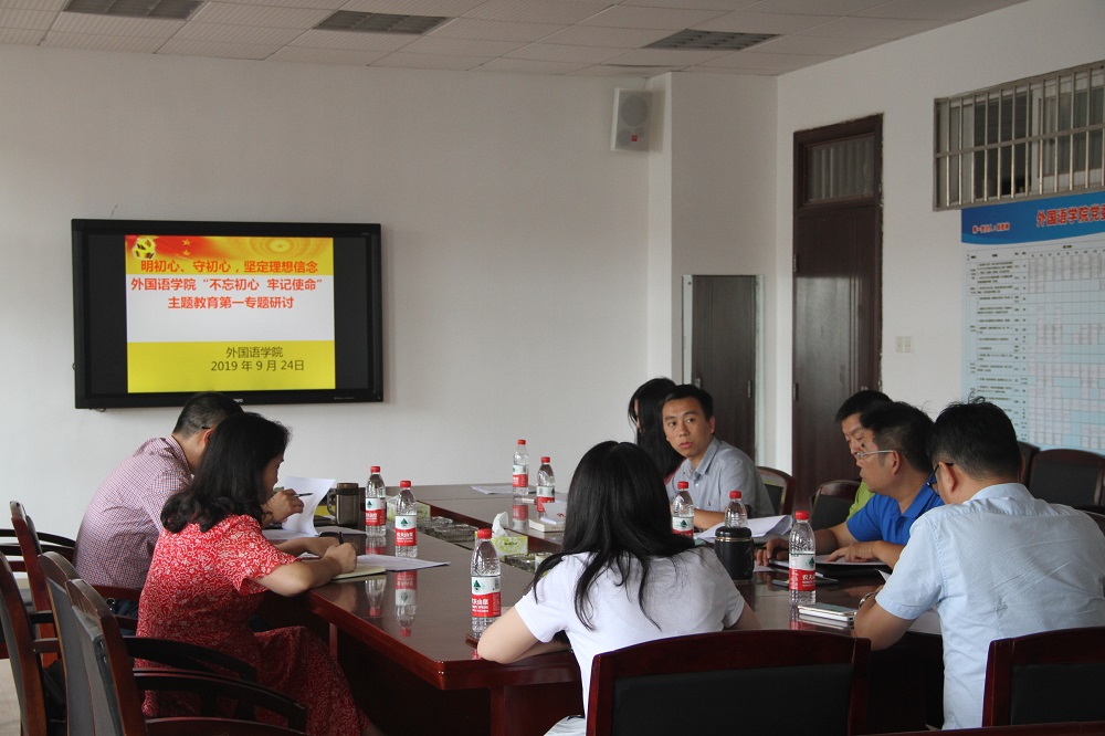 9月24日下午,外国语学院在文科楼A603会议室开展“不忘初心、牢记使命”主题教育第一专题研讨。学院党委副书记陈仁凯主持,学院党政班子全体成员参加,学校主题教育第三督导组负责人、学校纪委副书记兼监察处处长胡秀英出席指导。