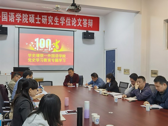 4月22日晚,外国语学院党委在金盆岭九教406会议室召开了党史学习教育“学史增信”第二专题中心组扩大会议,全体党政班子成员、各系部主任、各党支部书记参加会议。