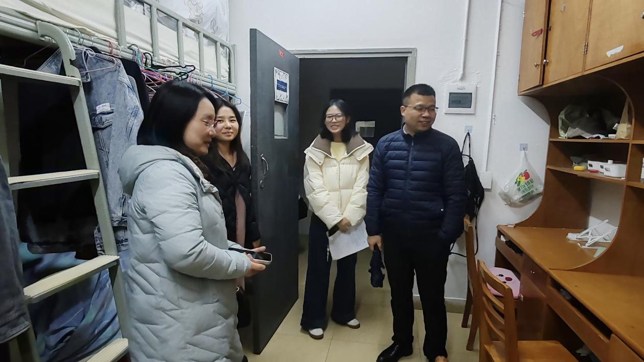 新学期伊始,为进一步掌握学生返校思想动态与生活适应情况,强化宿舍管理与安全保障,营造良好的学习生活环境,3月8日晚,外国语学院党委书记陈仁凯、院长段胜峰带领全体领导班子深入学生宿舍开展走访慰问,与同学们面对面交流,传递学院关怀,推动学生思想政治教育工作走深走实。