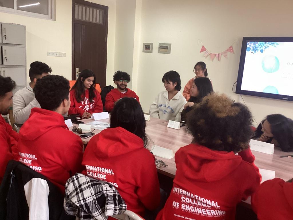 在单词风暴活动中,所有人以“志愿服务”为主题,说出一个与其有关的单词或词组,并和座位相邻或相对的同学交流。期间,外院学生用英语提问,留学生讲解自己经历、国家风俗等,辅以中文解释。大家围绕对志愿服务的了解和看法,如志愿服务的类型、益处、组织展开交流,分享亲身参与志愿服务的经历。期间唐东宇同学分享了她在特殊学校帮助孩子们学习的志愿服务经历,Rayan同学也分享了自己从高中开始就经常参加志愿服务。大家通过交流领悟志愿服务是帮助需要帮助的人,传递温暖与关怀,正因为有一颗颗温暖的种子,世界才会变得更美好。