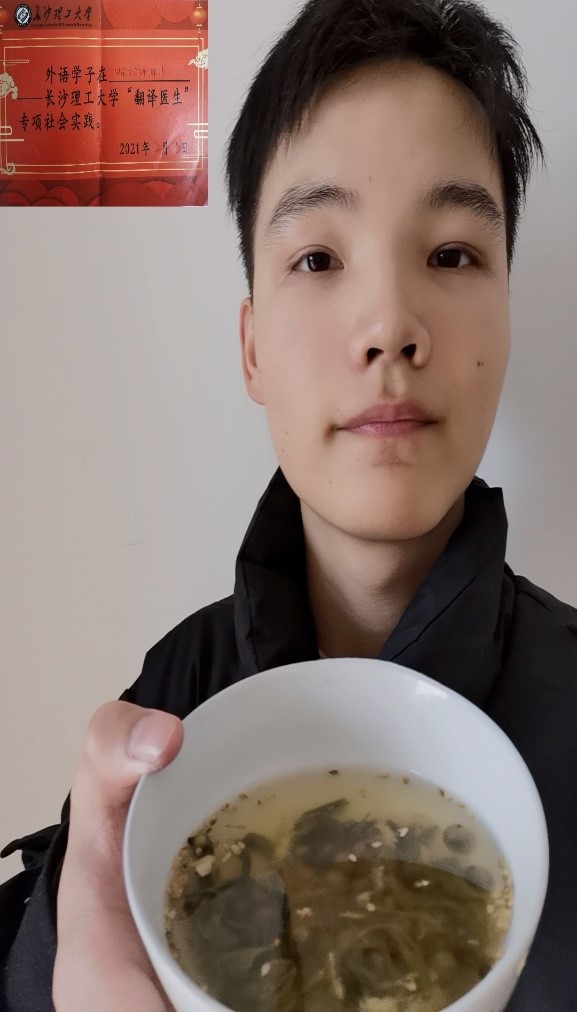 2021年2月16日,为深入学习贯彻习近平新时代中国特色社会主义思想,组织引导广大青年学生扎根中国大地了解国情民情,在加强志愿服务中增强责任感和使命感,在社会实践中受教育、长才干、做贡献,积极培育和践行社会主义核心价值观,结合疫情防控常态化要求,外国语学院翻译2002班雍佳锦在湖南省岳阳市湘阴县参与到了外国语学院“翻译医生”活动之家乡特产美食翻译活动中。此次活动,他通过网上搜集资料,拍照搜集资料和实践制作,完成翻译工作。