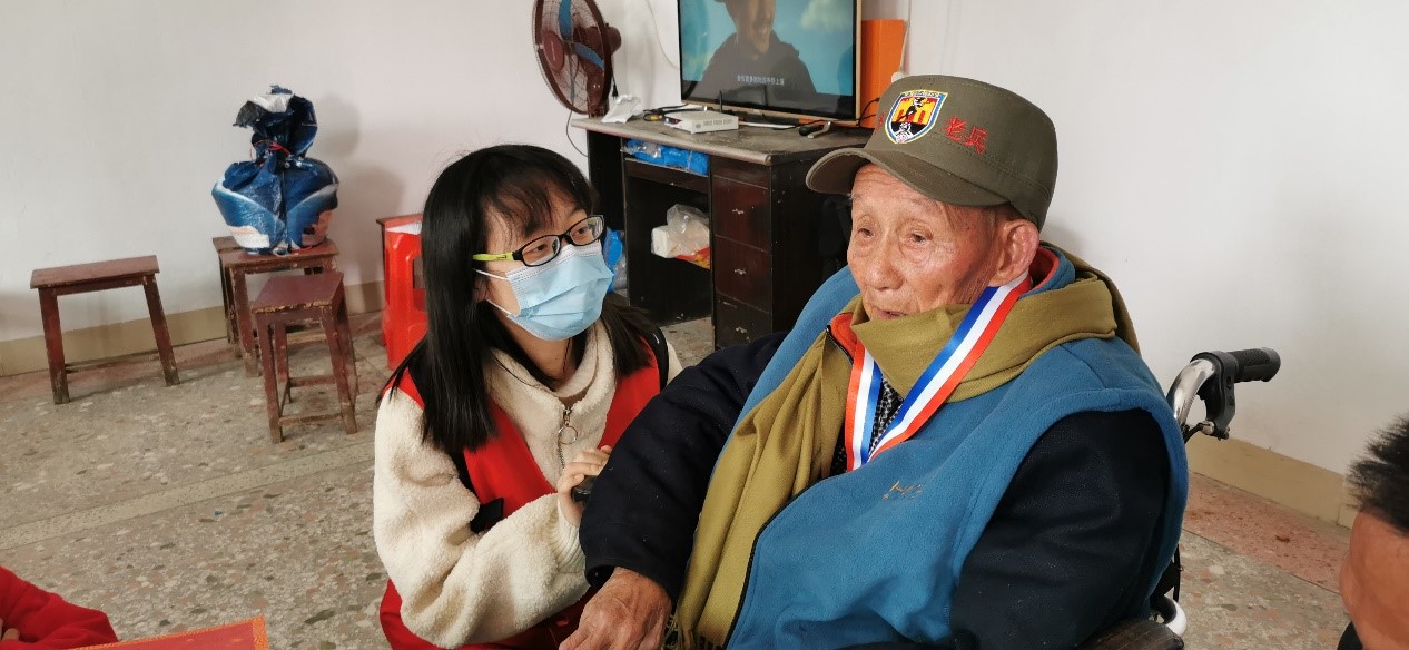 2021年2月5日,正值小年,桂阳县古郡志愿者协会会长谭宜达带领会员志愿者来到抗战老兵及老兵遗孀家中,为他们送去新春祝福,发放新春贺礼,陪伴他们共度佳节。为相应学院号召,提高社会实践能力,思想上进一步接受党的洗礼,坚定社会主义理想信念,作为志愿者协会的一员,外国语学院19级研究生吴熠敏随会长和其他志愿者踏上拜访老兵之旅。