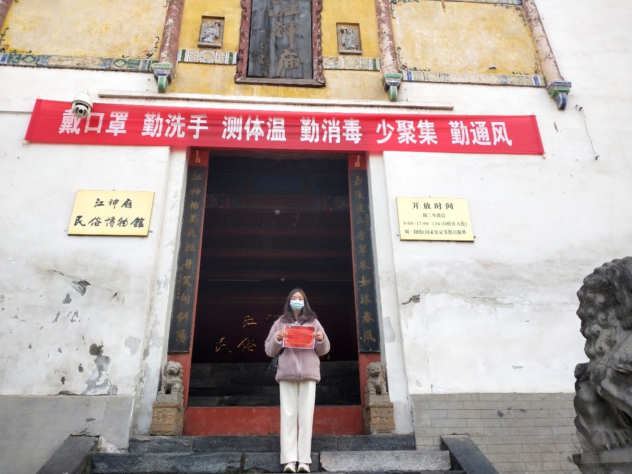 2021年1月25日,为响应学院号召,加强学生对家乡特色建筑及少数民族文化的了解和传承,促进民族文化交流,提高社会实践能力,外国语学院翻译1802班陈舒蓓来到略阳县民俗博物馆——江神庙,开展“翻译医生”活动。此次活动,她参观展馆、拍照、收集资料并上网查阅相关资料,完成实践报告以及相关翻译工作。