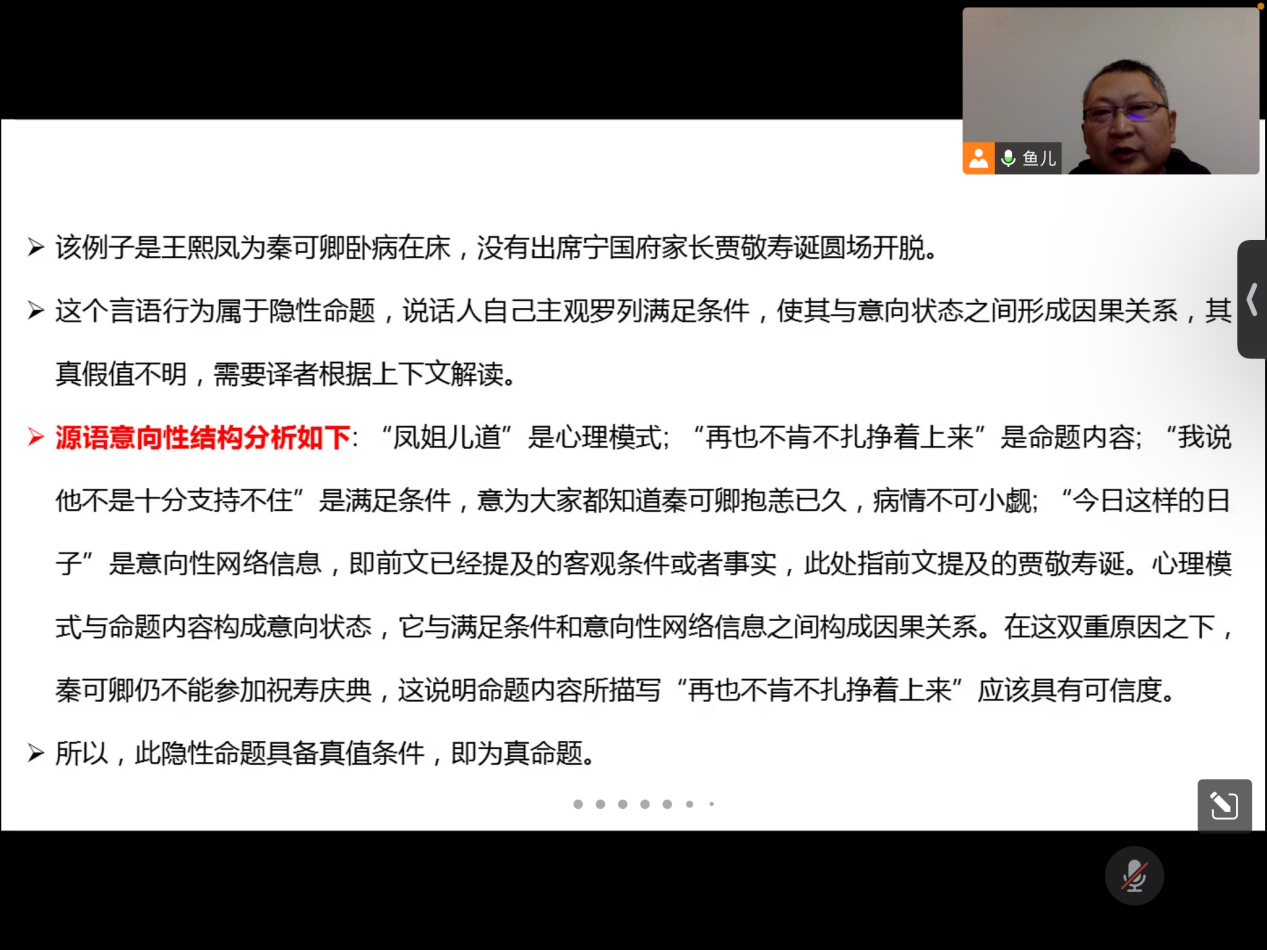2023年1月4日晚,外国语学院刘彬教授应邀为永利官网第十八届博力学术论坛 “翻译生态与生态翻译”专题论坛做了题为“意向性视域下翻译动态性研究”的讲座。我院部分教师及全体研究生参加了本次讲座。