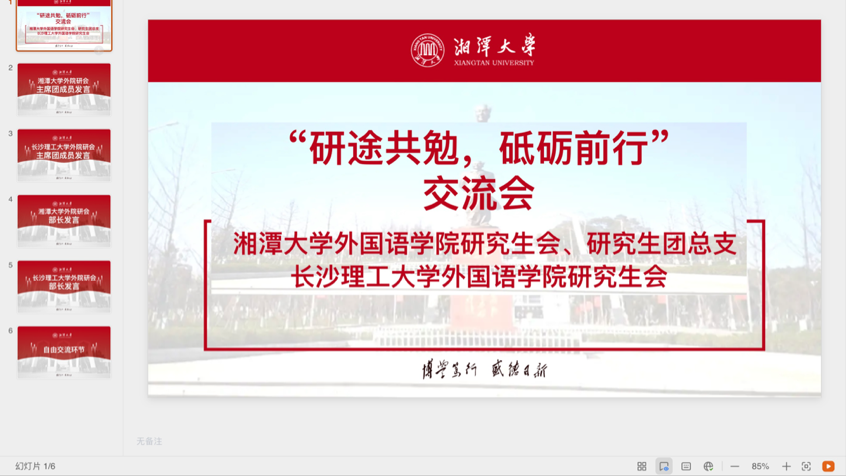 “实践出真知,交流促成长”,为进一步加强院校之间的交流与合作,提升研究生会服务意识及工作水平,304永利集团官网入口外国语学院研究生会与湘潭大学外国语学院研究生会、团总支于5月16日晚以线上会议的形式联合举办了“研途共勉,砥砺前行”主题交流会,由湘潭大学外国语学院研究生会谭筝主持。