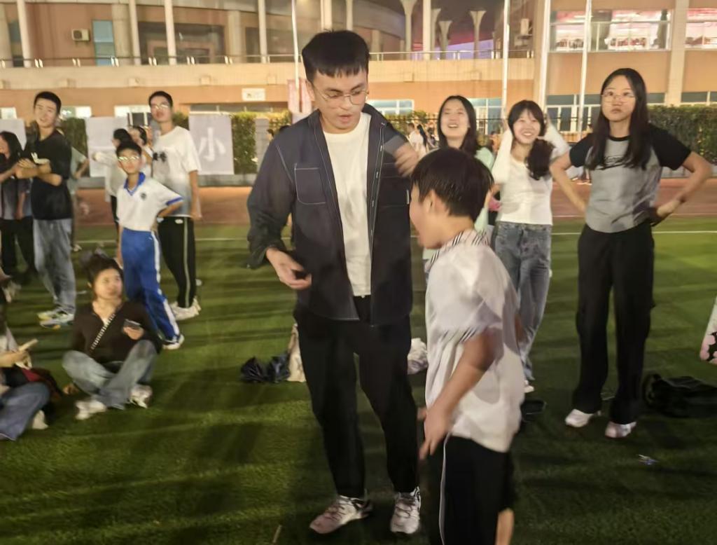 紧接着,活动进入了另一个高潮——“爱的抱抱”。在这个游戏中,同学们需要根据主持人喊出的数字迅速组成相应人数的团队。这个游戏不仅考验了大家的反应能力,还让大家在紧张刺激的氛围中感受到了团队合作的重要性。同学们在游戏中相互配合,共同应对挑战,展现了出色的团队精神。