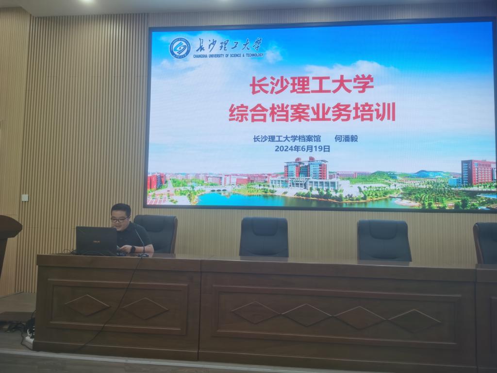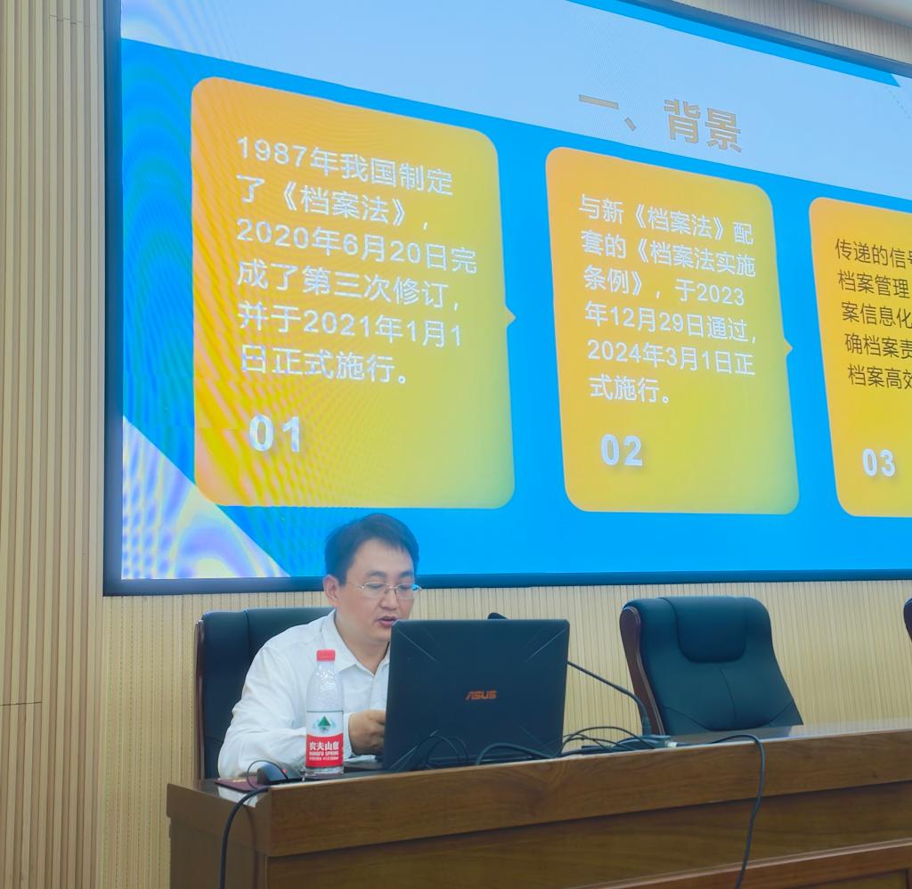 培训会上,湖南德立信科技发展有限公司产品经理付五锤作了《档案信息化建设先进技术及管理经验》专题报告,并介绍了省内部分高校信息化建设现状。档案馆馆务与数字化办公室主任张奎解读了2024年3月1日起新颁布施行的《中华人民共和国档案法实施条例》,并就永利官网档案工作有关管理规定作了说明。综合与学生档案室主任蔡焰辉对学生人事档案的收集整理、移交、转递工作进行了详细讲解。何潘毅老师对综合档案的收集整理、移交及综合档案管理平台的使用进行了深入讲解。