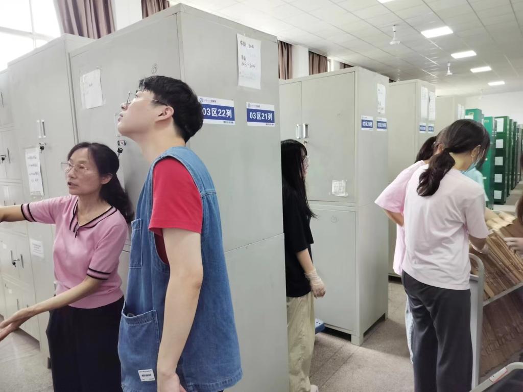 第二组26人,主要负责档案馆资源普查工作。同学们在老师的带领下,对301库房档案资源进行全面普查和整理,记录了各类档案的种类、数量、保存状态等信息,并对档案的分类、整理、保存和检索等流程进行深入学习和操作。