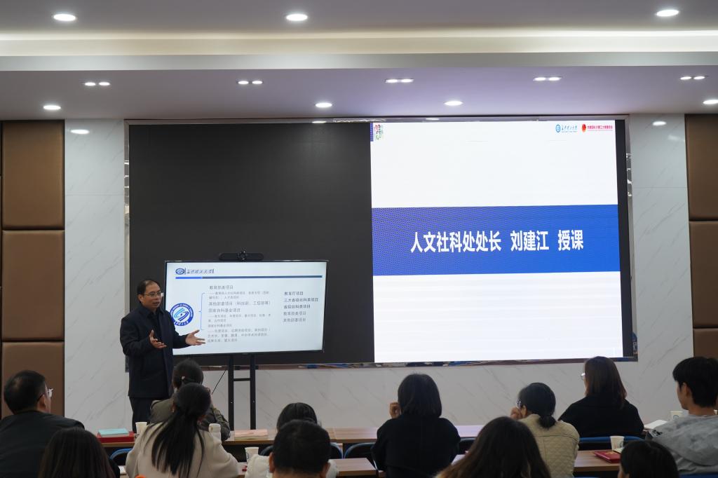 之后,刘建江从科研管理人的视角围绕项目申报学和系列项目筹划两个方面进行讲座,详细阐释了项目申报学的核心、项目申报书的“七性”、项目申报学的心理学,并表示希望广大青年工作者要协调好个人与集体的关系,紧跟时代步伐,围绕学校行业办学特色、双主体发展战略定位,秉持“匠心”和“文心”,爱岗位敬业,厚植家国情怀,做好青年相关理论研究与实践工作,在人才培养、学科建设、科学研究等方面为学校百强大学建设贡献应有力量。