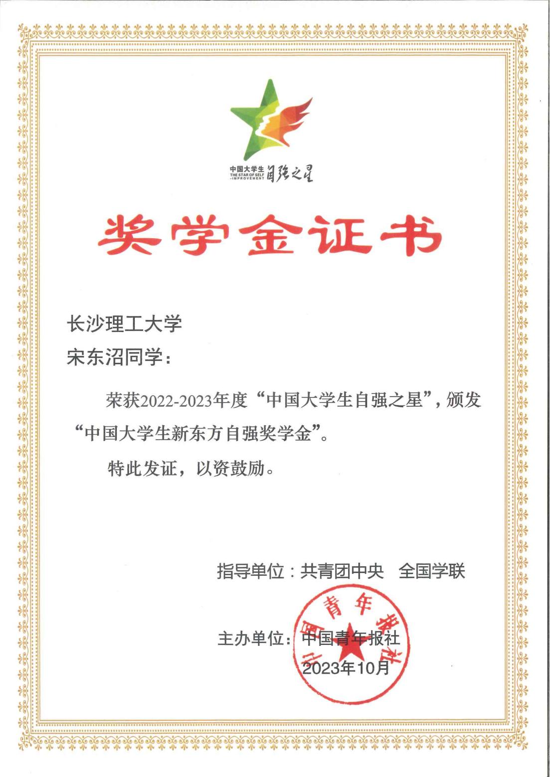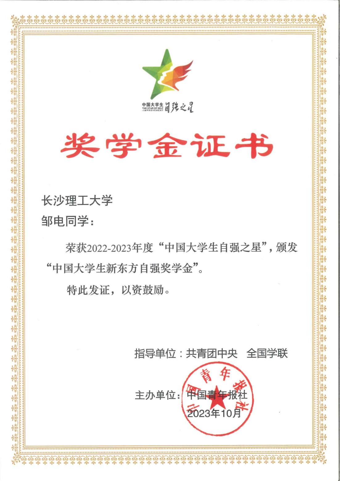 2022年8月20日,由共青团中央、全国学联指导,中国青年报社、新东方教育科技集团、中国青年创业就业基金会联合开展的2022年度“中国大学生自强之星”奖学金推报活动结果揭晓,永利官网汽机学院2020级本科生宋东沼同学和计通学院2020级研究生邹电同学从众多学子中脱颖而出,荣获2022年度“中国大学生自强之星”。