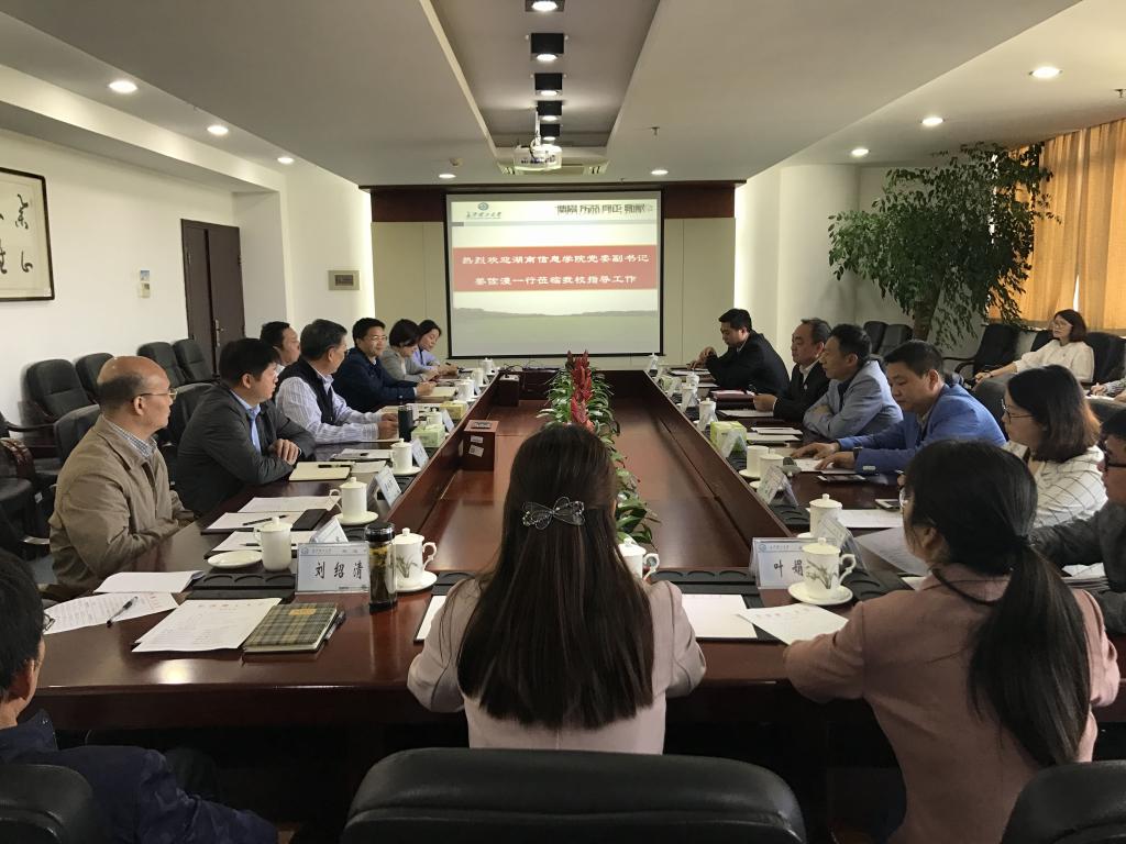 4月18日上午,湖南信息学院党委副书记姜佐醴一行15人来校调研。永利官网副校长谈传生,组织部部长齐路良、招生就业处处长方文彬、校团委书记陈曦、学工部副部长霍向阳、心理中心副主任龚勋、创新创业学院副院长杨建军、电气学院副书记丁丹出席了调研座谈会。座谈会由谈传生主持。