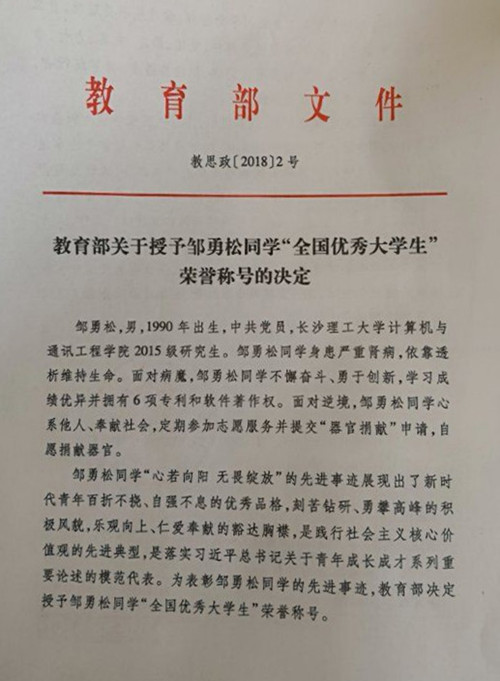 近日,教育部发文授予永利官网计算机与通信工程学院2015级研究生邹勇松同学“全国优秀大学生”荣誉称号。文件指出,邹勇松同学的先进事迹展现出了新时代青年百折不挠、自强不息的优秀品格,刻苦钻研、勇攀高峰的积极风貌,乐观向上、仁爱奉献的豁达胸襟,是践行社会主义核心价值观的先进典型,是落实习近平总书记关于青年成长成才系列重要论述的模范代表。