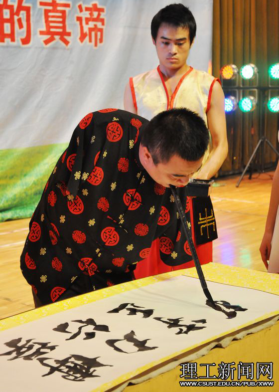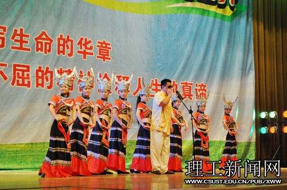 由聋哑人表演的舞蹈《开门红》、《黄土黄》,盲人表演的葫芦丝独奏《月光下的凤尾竹》、吹火柴盒《苗岭的早晨》,肢残者表演的舞蹈《鹰之翼》、歌曲《荷塘月色》、《春天里》、小品《别无选择》、摇滚串烧等,一次次将现场的气氛推向高潮。双手截肢的王剑华现场用口含毛笔书写了“博学、力行、守正、拓新”八个大字,并赠予学生代表。舞蹈《千手观音》压轴登场,无声世界里的她们用整齐划一的动作,美伦美焕的造型,令现场沸腾。同学们纷纷跑下看台,近距离观看。