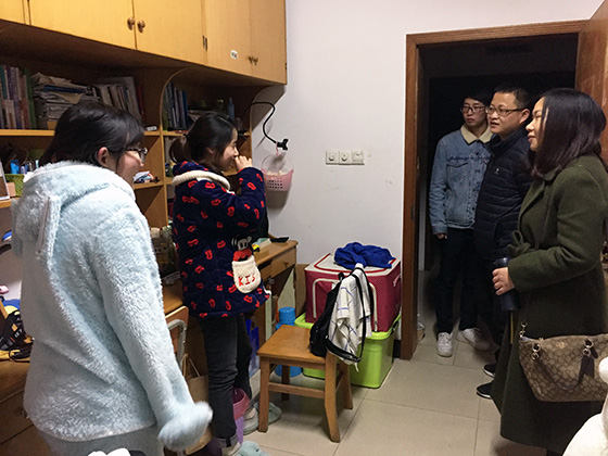寒假来临之际,为进一步排除安全隐患,切实做好学生安全离校工作。1月18日晚,化学学院党委副书记汪功伟,学工办刘文成、胡佳佳、江洁、兰贵辉、李永睿一行深入研究生、本科生宿舍和实验室看望学生,关注学生离校情况,进行安全巡查。