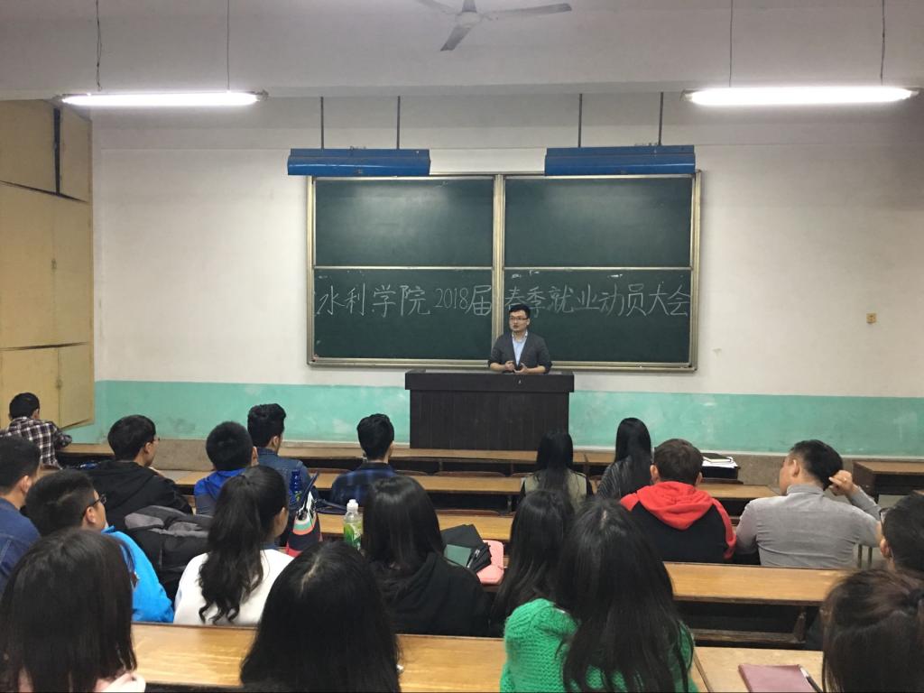 330日晚,水利工程学院在金盆岭校区3115室举行2018届春季就业动员大会,会议由院党委副书记王学成主持,学院就业专干贺志琼,2018届全体未就业研究生、本科生参加本次会议。