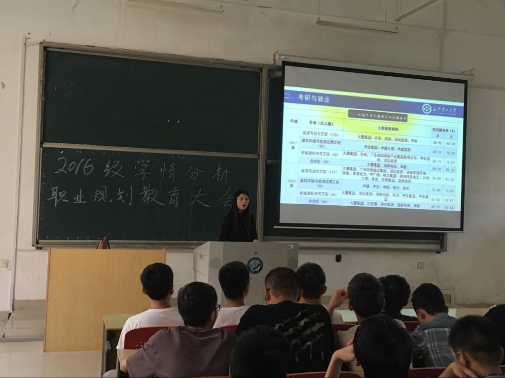 5月8日下午,能动学院在工一A-106分批次召开了2016级学情分析暨职业规划教育大会。会议由学工办辅导员汪华丽、代佳欣主讲,16级全体学生参加。