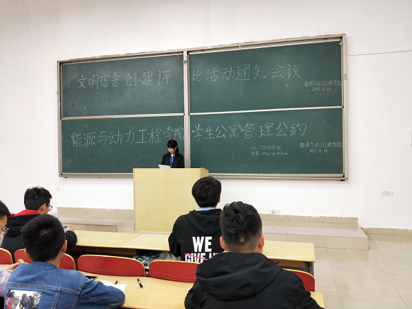 5月8日晚,能动学院在工一a208召开班长会议,各班班长及分团委学生会生活权益部参加。生活权益部部长易萍公布了《能源与动力工程学院学生公寓管理公约》,发起文明寝室倡议活动。