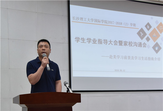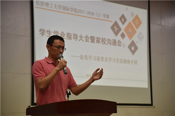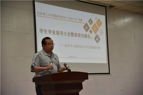 5月14日上午,国际学院2017-2018(2)学期学生学业指导大会暨家校沟通会在云塘校区文科楼圆厅顺利召开。此次会议邀请永利官网中外合作办学项目(土木工程专业)美方合作院校田纳西大学查塔努加分校工程与计算机科学学院土木工程系教授Ignatius Fomunung,美国田纳西大学诺克思维尔分校教授Huang Baoshan,美国肯尼索州立大学教授Yang Jidong作为主讲嘉宾,就学生赴美学习前景及学习生活指南进行介绍。国际学院院长陈瑜,中外合作办学项目办公室主任黄文卫、辅导员唐宏敏和刘森峙,全院学生及30多位家长代表出席了会议。学业指导大会由学院党委副书记兼副院长吴振华主持。