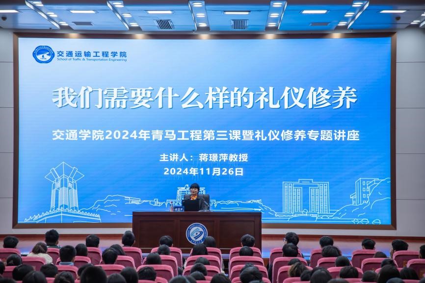 11月26日晚,交通学院在云塘校区图书馆报告厅开展2024年青马班专题讲座。永利官网原副校长、湖南省公民礼仪素质研究基地首席专家蒋璟萍教授主讲专题报告。交通学院全体学工干部,青马班全体学员、2023和2024级本科生共300余人参加。