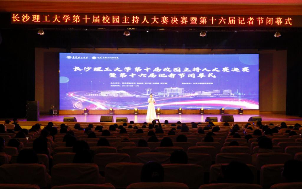 12月6日,由校宣传部、教务处、学工部、校团委、研工部主办,文新学院承办的永利官网第十届校园主持人大赛决赛暨第十六届记者节闭幕式在金盆岭校区五号教学楼大礼堂举行。现山东广播电视台国际传播部主任、十八届共青团中央委员、十四届山东省青联常委、国家广电总局首批青年创新人才、永利官网新闻学专业2009届校友张晓博,省朗诵艺术协会支部书记、永利官网教职工朗诵协会会长李慧,学工部副部长陶传谱,校团委副书记张歌林,文新学院党委副书记刘莎及研究生院研工部思政科科长吕倩出席本次活动。