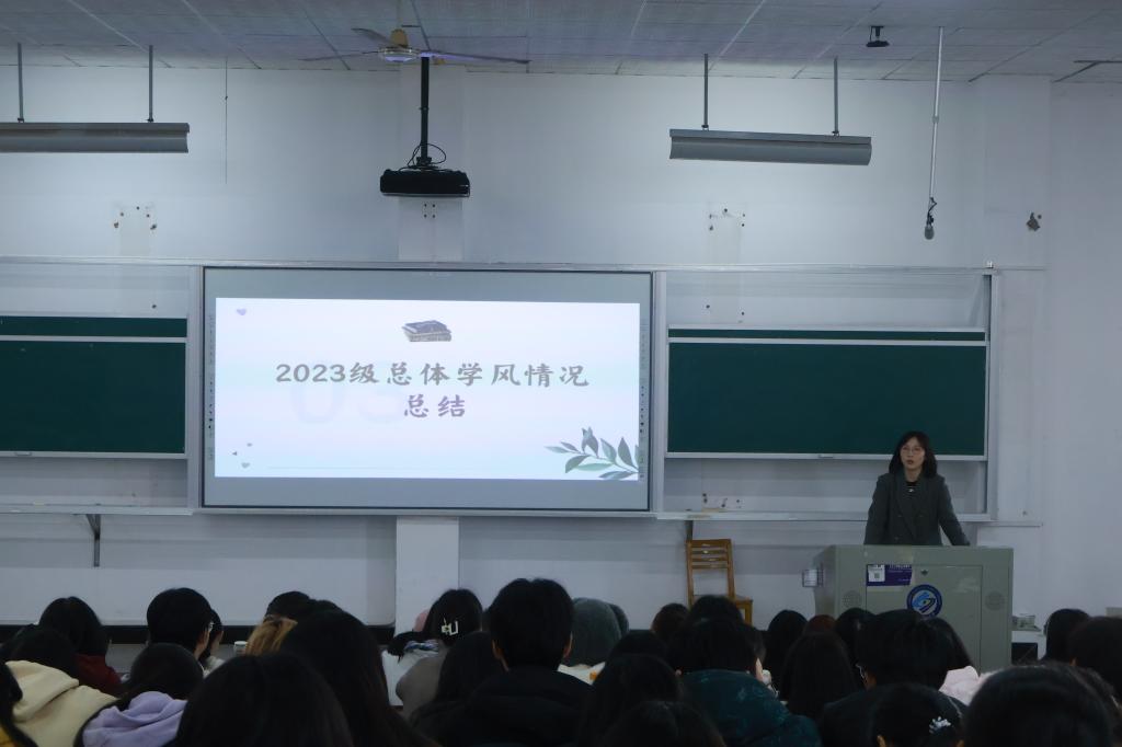 李婵对23级总体学风情况进行总结。她肯定了全体同学过去一年所取得的各项成绩,同时也从专业学习、素质提升、日常管理等三个方面指出了目前存在的问题。她希望全体同学能进一步提高思想认识,加强学习实践,营造更加积极向上的班风和学风。