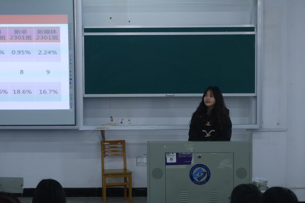 汉语言2102班李安楠同学在会上分享了大学学业发展及职业规划经历。她从专业课程学习、综合素质拓展、职业能力提升等几个方面展开讲述,建议23级同学要明确自身目标及规划,注重提高学习效率,积极参加校院活动,不断提升自己的核心竞争力。院学生会学创部葛依楠同学作23级大一学年学情数据报告,她详细分析了各专业班级的绩点、挂科率、四六级过级等情况,帮助同学们对自身学习情况有了更全面的了解