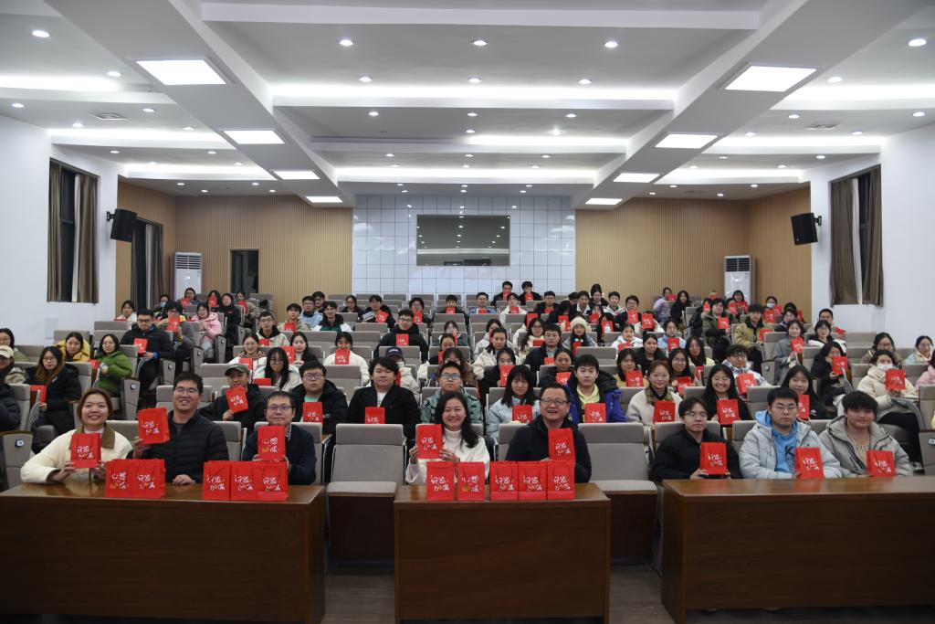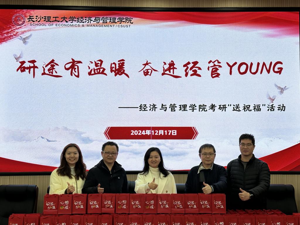 12月17日晚,为给考研学子送去温暖与祝福,经管学院于金盆岭校区经管大楼100报告厅举办“研途有温暖,奋进经管YOUNG”考研送祝福活动。院党委书记马丽、副书记汪功伟副院长何昊,辅导员杨舒文、王宝宝以及2025届考研学子参加活动活动由汪功伟主持。